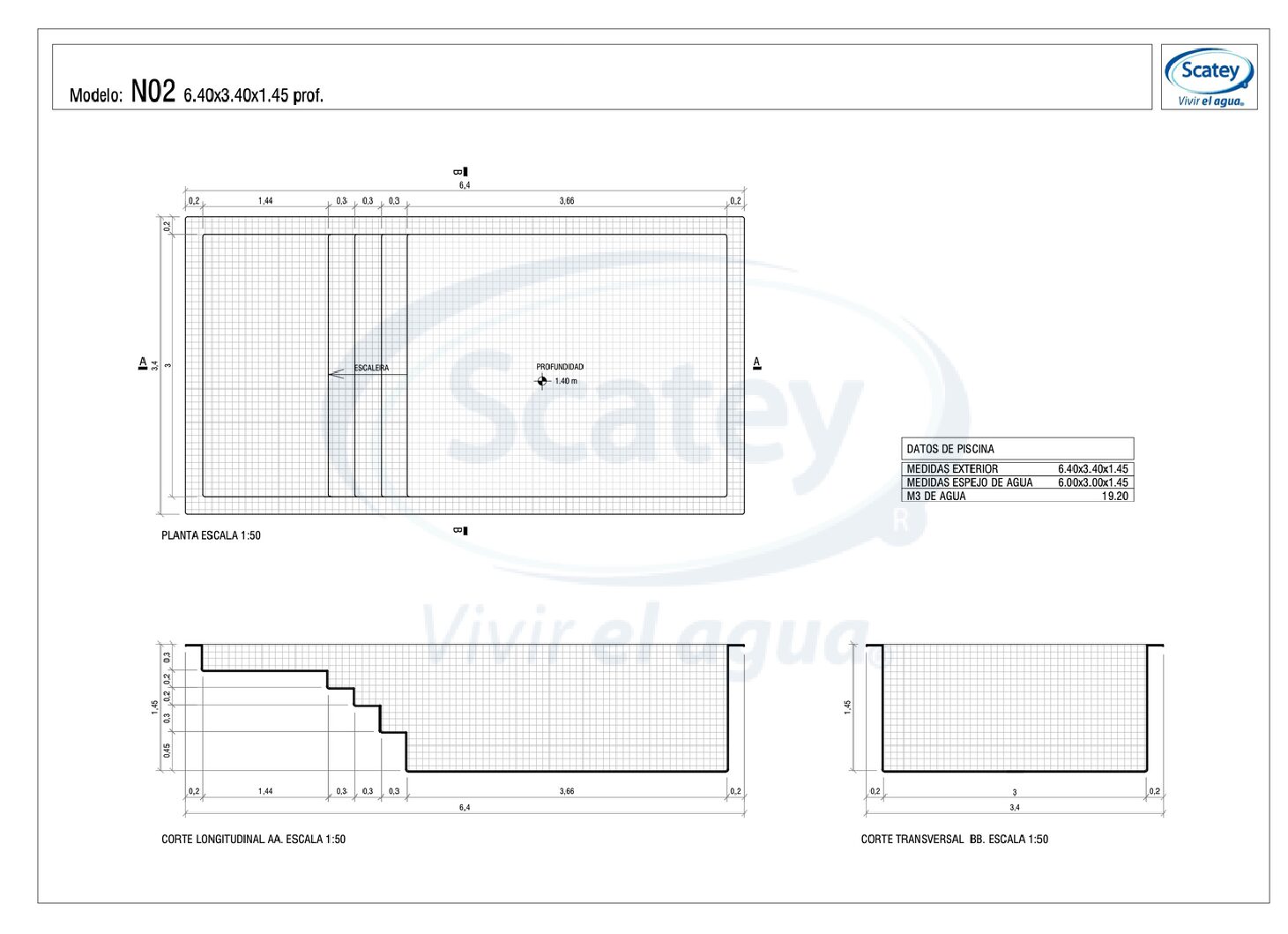 Largo: 6,0 m | Ancho: 3,0 m | Profundidad: 1,45 m